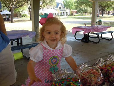 Well, it has taken me a whole week to recover from all of the birthday festivities a week ago but now I'm ready to blog :-) We had to have a sweet shoppe theme for Caroline's 3rd birthday party since we have a Sweet Caroline! It was a fun theme, and Caroline was so excited about all of the "sweets". She also wanted EVERYTHING to be pink and purple (of course). We found a park near our home to have the party, and we lucked out with great weather.